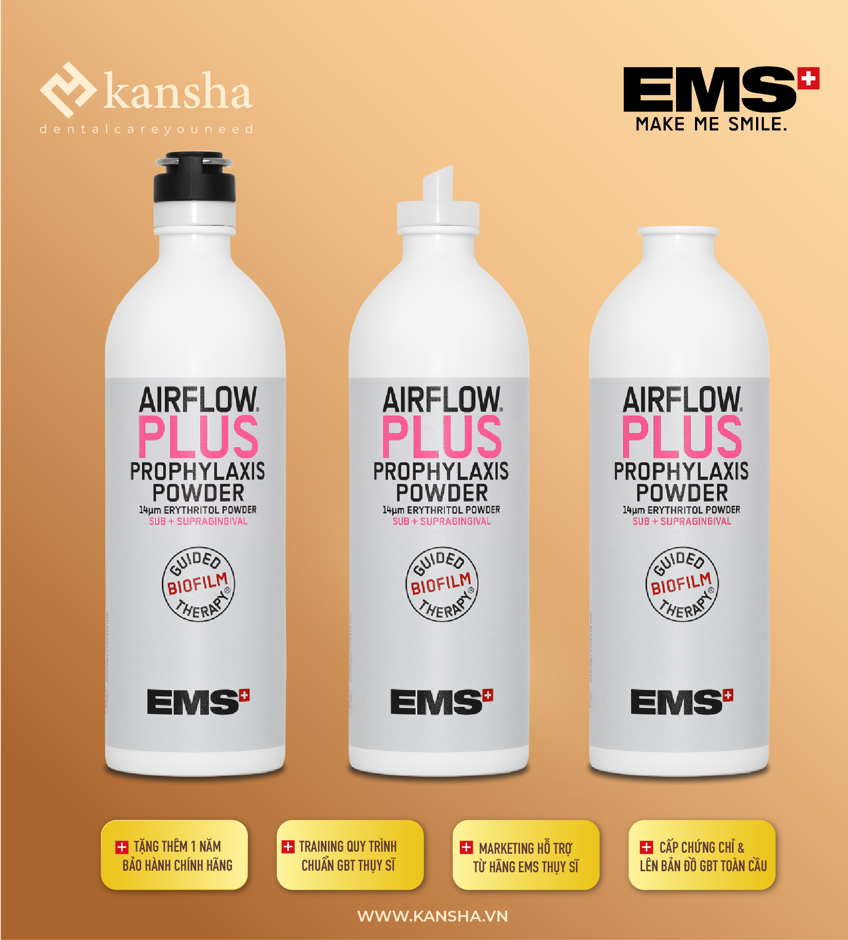 Bột AIRFLOW® PLUS mới là động lực chính thúc đẩy quy trình GBT của chúng tôi, mang lại kết quả điều trị nhất quán và đáng tin cậy, cùng tiêu chuẩn cao nhất về sự thoải mái cho bệnh nhân. Dựa trên Erythritol, các hạt vi mô được cấp bằng sáng chế của bột AIRFLOW® PLUS EMS đã được chứng minh lâm sàng là rất hiệu quả trong việc loại bỏ màng sinh học mà không gây tổn thương cho mô cấy ghép hoặc mô.